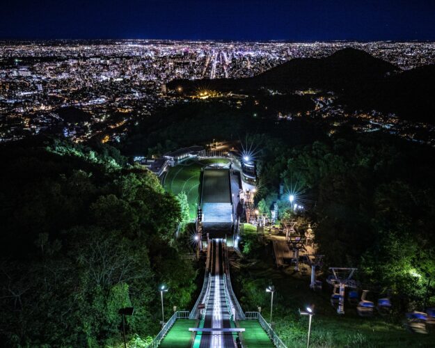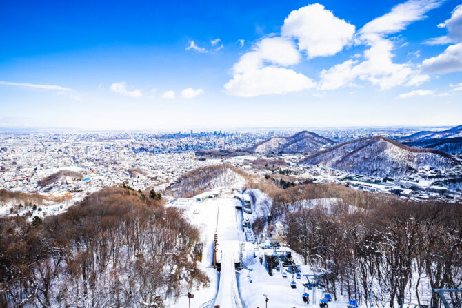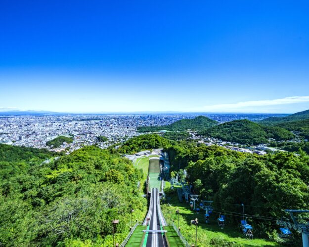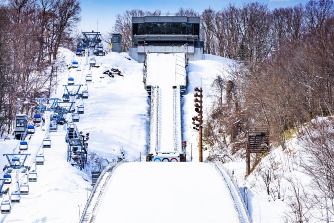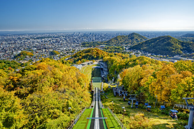 大倉山は、1972(昭和47)年に開催された冬季オリンピック札幌大会でジャンプ競技場の開催場所でした。リフトを使って頂上へのぼると展望ラウンジがあり、標高307mの地から札幌の市街地や石狩平野、石狩湾が一望できます。