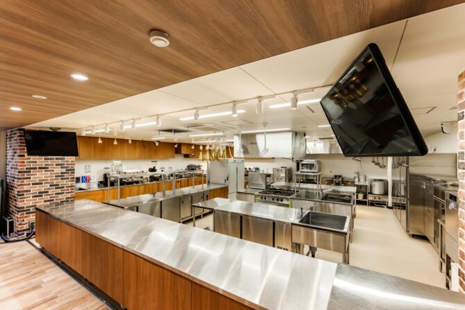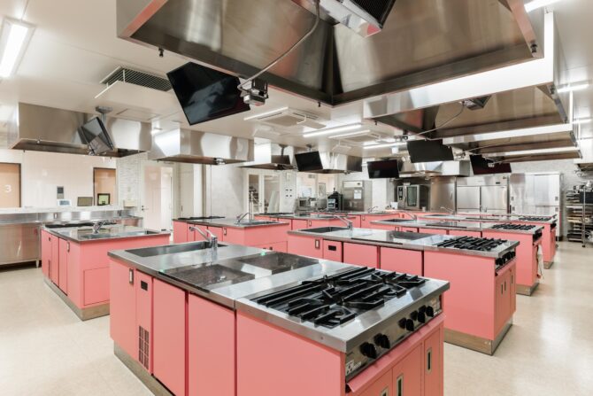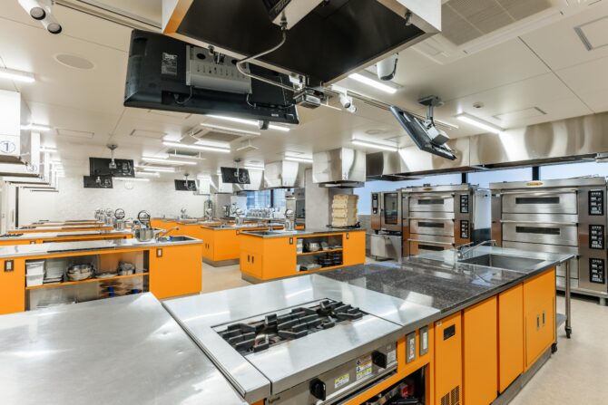 札幌大通にある札幌ベルエポック製菓調理・美容専門学校では、製菓、製パンなどすべてに対応できる最新の設備が完備されている製菓実習室や、校舎入り口を入るとすぐに見えるおしゃれなカフェ実習室など、様々な仕事場を想定した調理実習施設があります。映画のワンシーンからキッチンスタジオとして、テレビのバラエティー番組までのご相談することが出来ます。