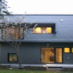 西区にあるHさんの宅は、事務所兼自宅です。1階にオフィス、2階に家族の居住空間を配し、それぞれに独立した動線を設けました。2階の住宅から窓越しに1階の人の出入りが見えるのが特徴です。また、大きな窓が多く、窓越しに近接する緑道や空を望む居住空間は、まるで森の中にいるような空間とします。