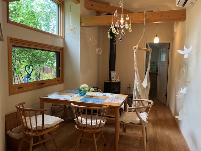 内装は店主こだわりの照明、ストーブ、家具の数々。