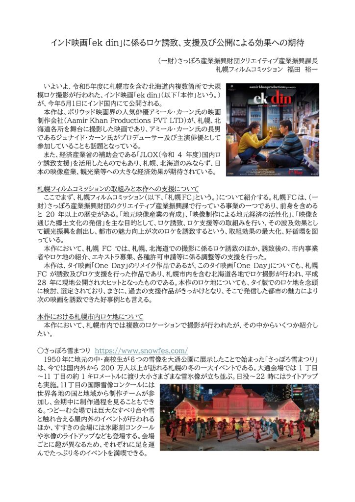 札幌フィルムコミッションが撮影誘致、支援したインド映画「ek din」(2026年5月1日インド国内にて公開)について、公益財団法人日印協会の機関誌「MJIA」の2026年4月号にて以下の記事を寄稿し掲載されました。ぜひご一読ください!